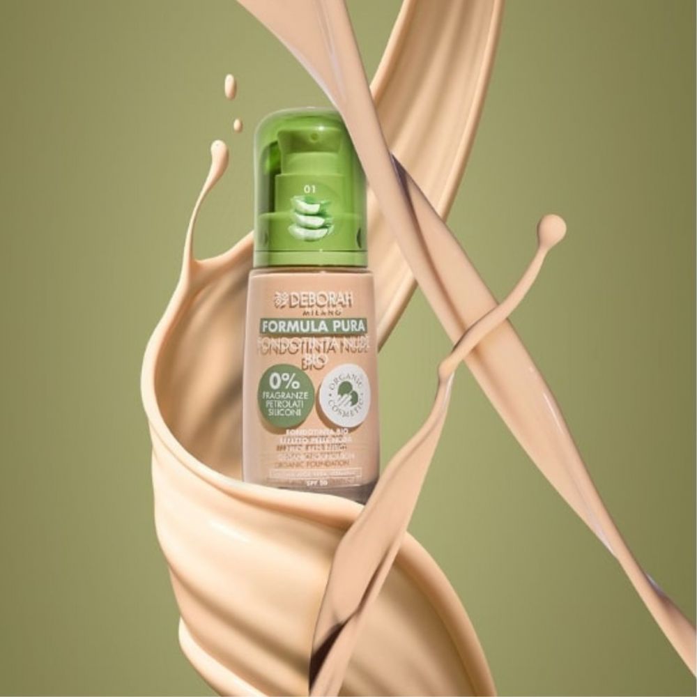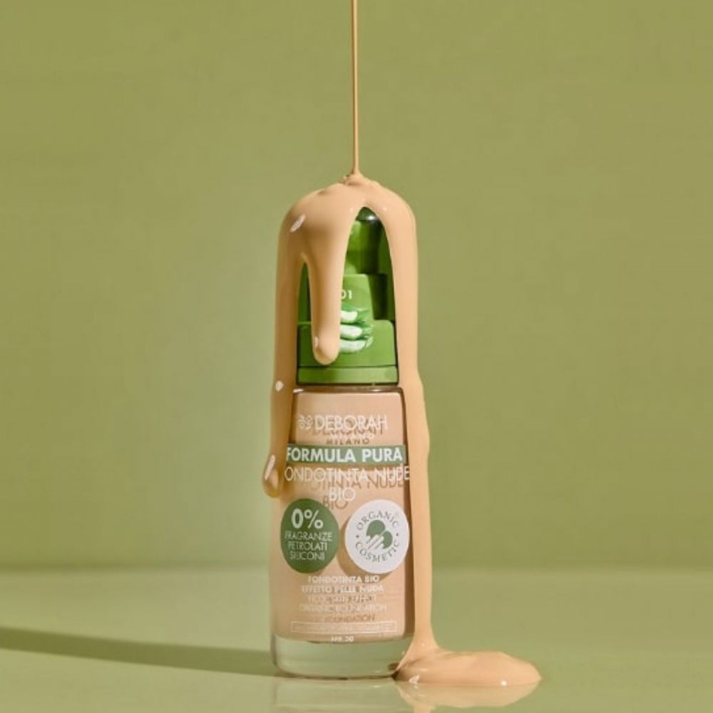 - Make-up Formula Pura s Aloe Vera a vitaminem C Nude BIO - kombinuje nové organické složení s fluidní texturou s přirozeným finišem a středním krytím, které umožňuje vyniknout Tvé přirozené kráse. Je obohacen o vyživující a antioxidační aktivní složky, jako je organické aloe vera a vitaminy C a E, které jsou schopny pleť vyživit a dodat jí bezchybný vzhled. Ochrana proti UV záření díky SPF20. Neobsahuje silikony, vazelínu ani přidané parfémy. Jako obal je použita skleněná lahvička s recyklovanými plastovými komponenty pro šetrné řešení k životnímu prostředí.