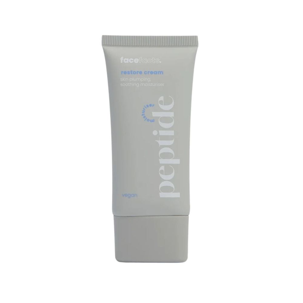 Hydratovaná, hladká a pružnější pleť každý den. Face Facts Peptide Restore Cream je vyživující pleťový krém s peptidy, který pomáhá doplnit hydrataci, zlepšit pružnost pokožky a zanechat pleť jemnější a hladší. Díky kombinaci peptidů, kyseliny hyaluronové a zklidňujícího allantoinu pomáhá pleť vyhladit, zjemnit a podpořit její přirozenou hydrataci. Lehká, ale výživná textura se rychle vstřebává a zanechává pleť komfortní, hebkou a přirozeně rozzářenou.