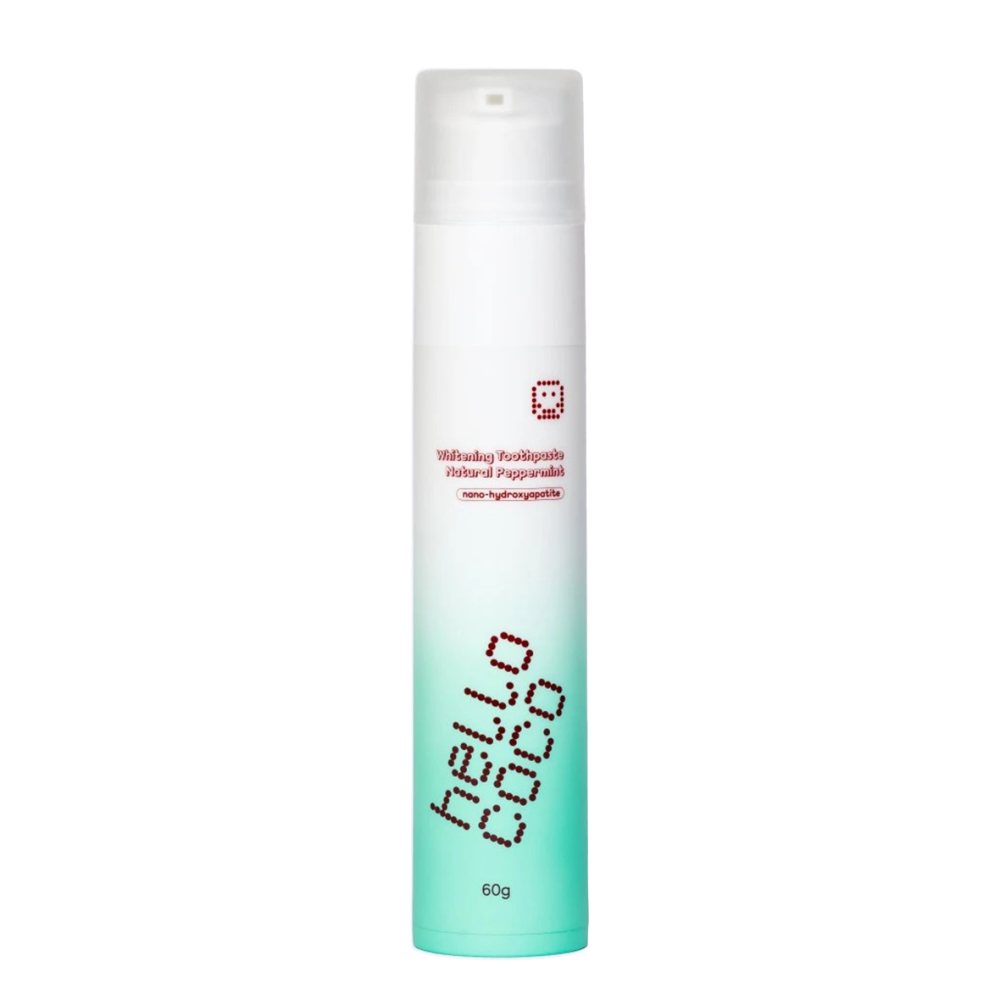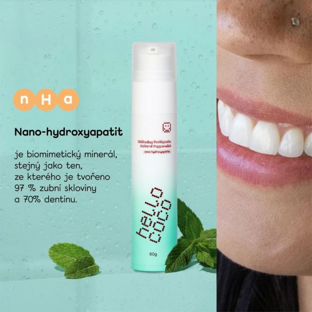 Hello Coco n-HA bělicí zubní pasta Peppermint spojuje jemné bělení, posílení skloviny a svěží mátovou chuť do každodenní rutiny, která je šetrná a zároveň účinná. Díky obsahu hydroxyapatitu (n-HA) pomáhá remineralizovat zubní sklovinu a zlepšovat její vzhled – bez peroxidu a bez podráždění.