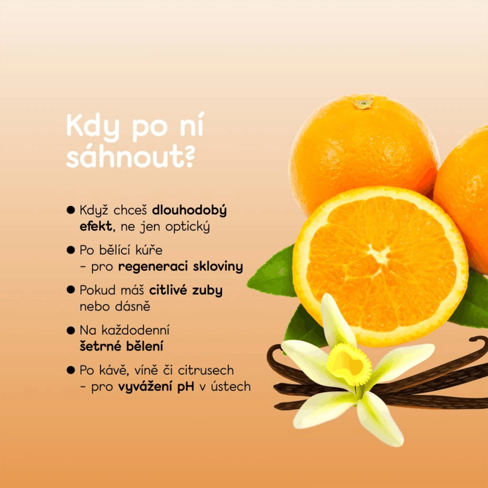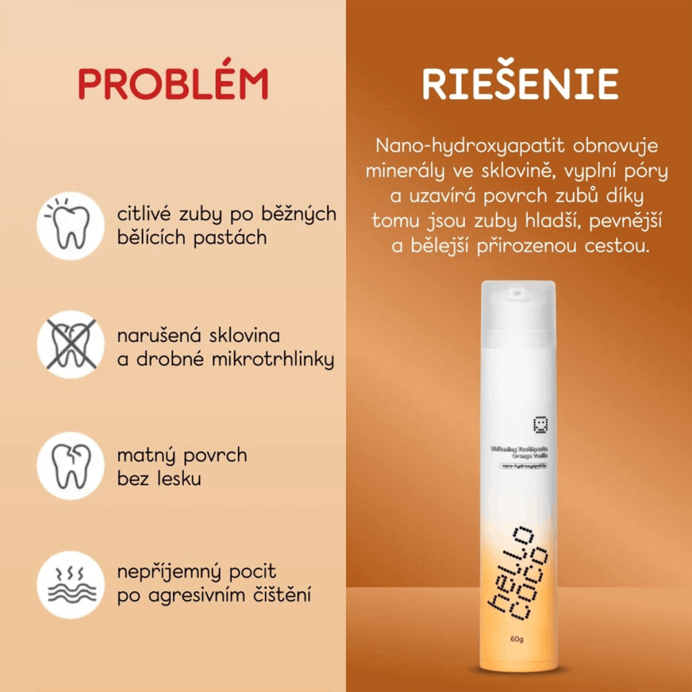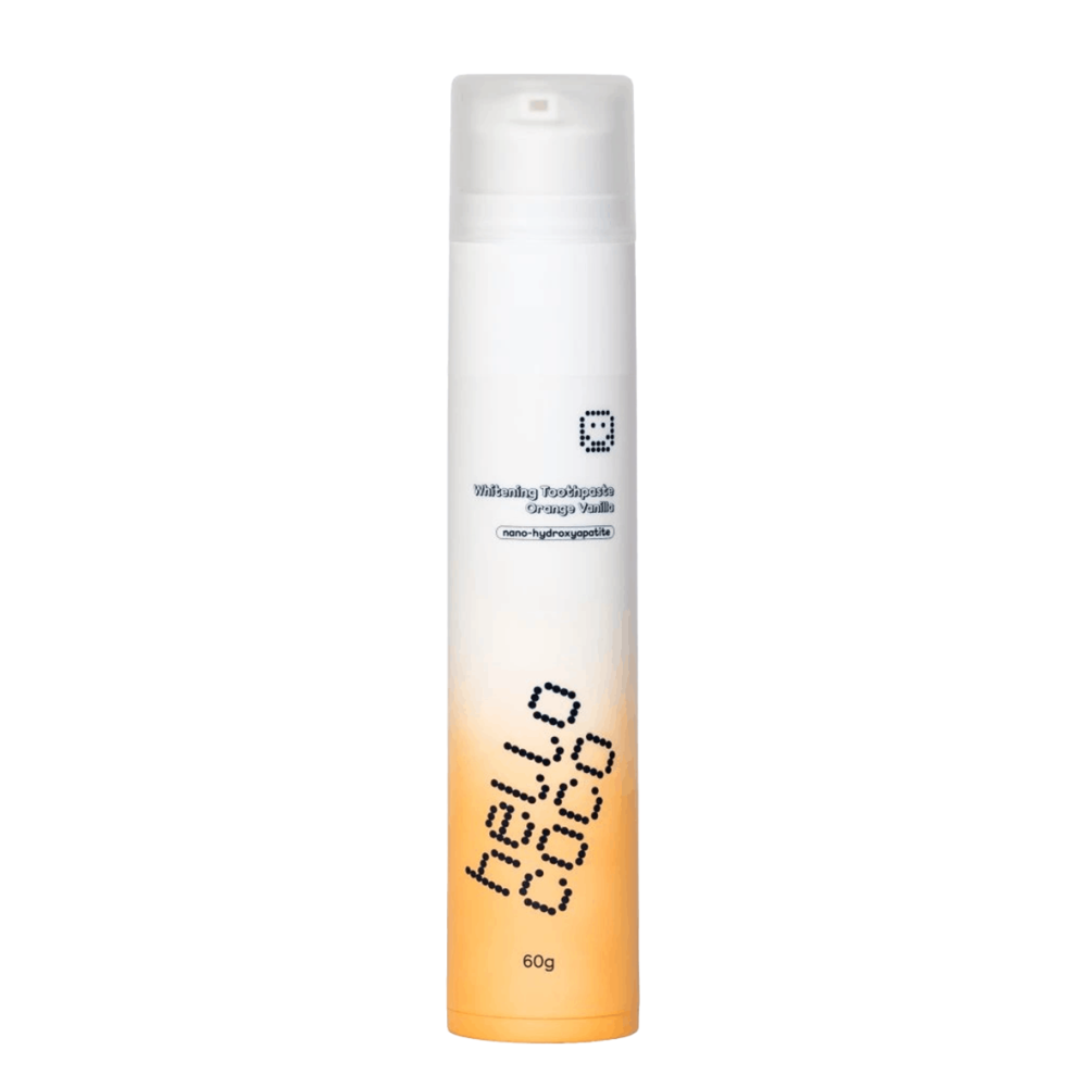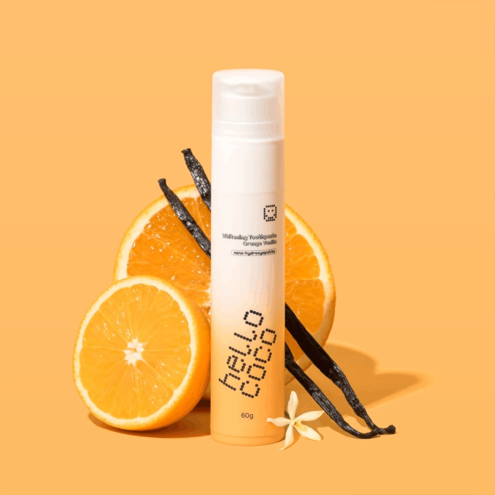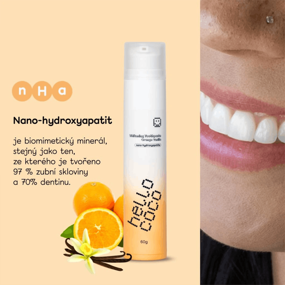 Hello Coco n-HA bělicí zubní pasta Pomeranč & Vanilka kombinuje pokročilou n-HA technologii s jemným bělicím účinkem a osvěžující ovocno-vanilkovou chutí. Pasta posiluje sklovinu, snižuje citlivost zubů a zanechává dech svěží – to vše bez peroxidu a podráždění.
