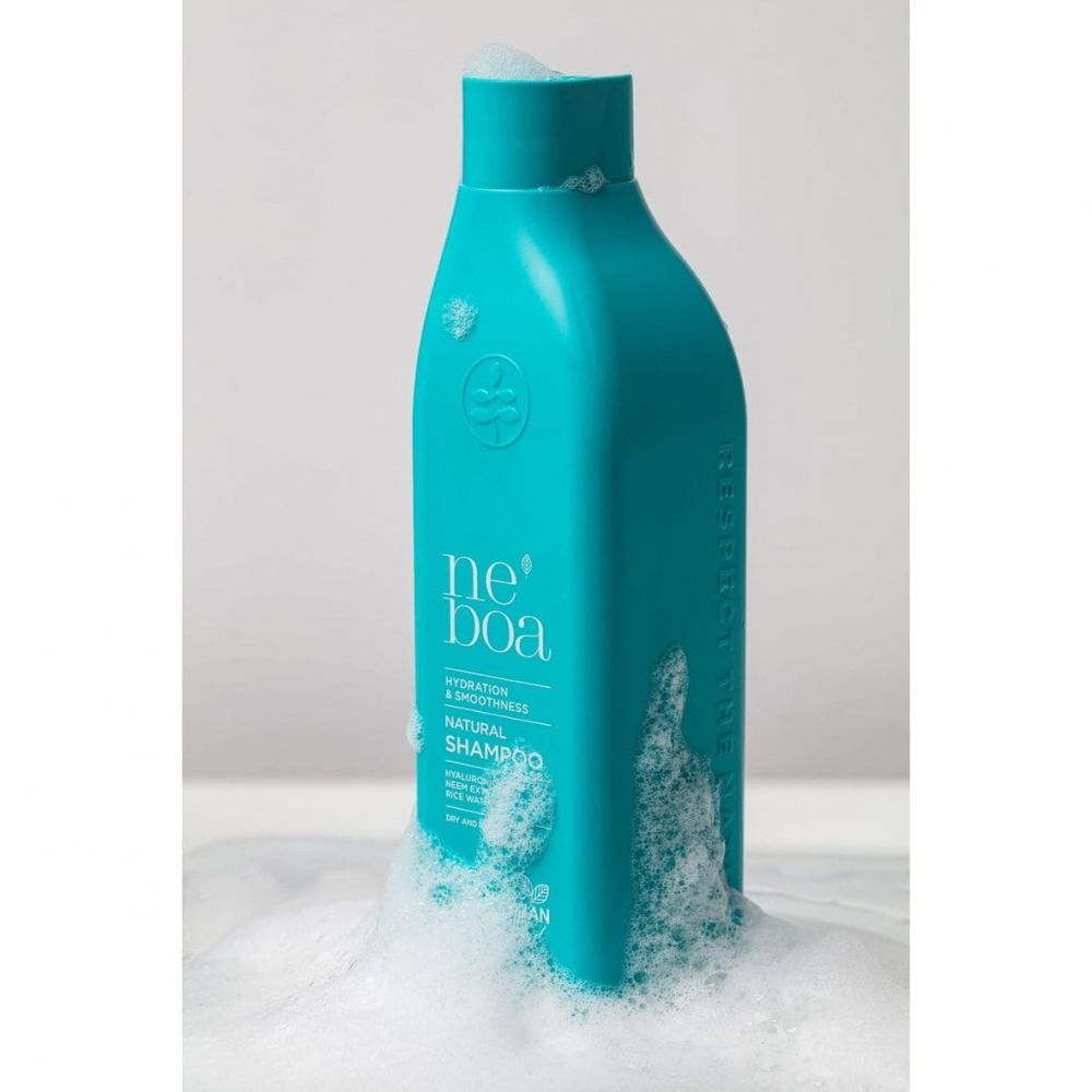 Přírodní hydratační šampon Neboa Hydration & Smoothness, účinně čistí pokožku hlavy a vlasy díky přírodním látkám, které nevysušují a nedráždí. Kyselina hyaluronová hloubkově hydratuje a uhlazuje vlasy a navrací jim lesk. Extrakt z neemu působí proti zamotávání a krepatění vlasů. Rýžová voda vlasy vyživuje, obnovuje a dodává jim přirozený objem.