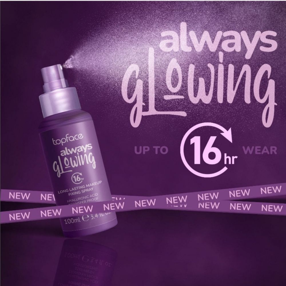 Fixační sprej vytváří na make-upu neviditelnou a lehkou ochrannou vrstvu, která make-up zafixuje a pomáhá osvěžit a hydratovat pleť díky svému složení s kyselinou hyaluronovou. Fixační sprej Always Glowing zajistí, že make-up zůstane neporušený a bude mít zářivý povrch až 16 hodin.
